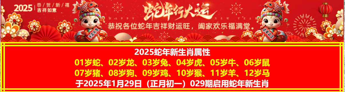 | 2025蛇年新生肖属性 01岁蛇、02岁龙、03岁兔、04岁虎、05岁牛、06岁鼠 07岁猪、08岁狗、09岁鸡、10岁猴、11岁羊、12岁马 于2025年1月29日(正月初一)029期启用蛇年新生肖 |